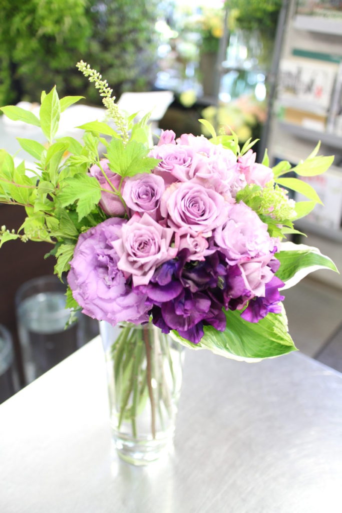 紫色の大好きなお母様へ。 紫のグラデーションのお花束をお届け。