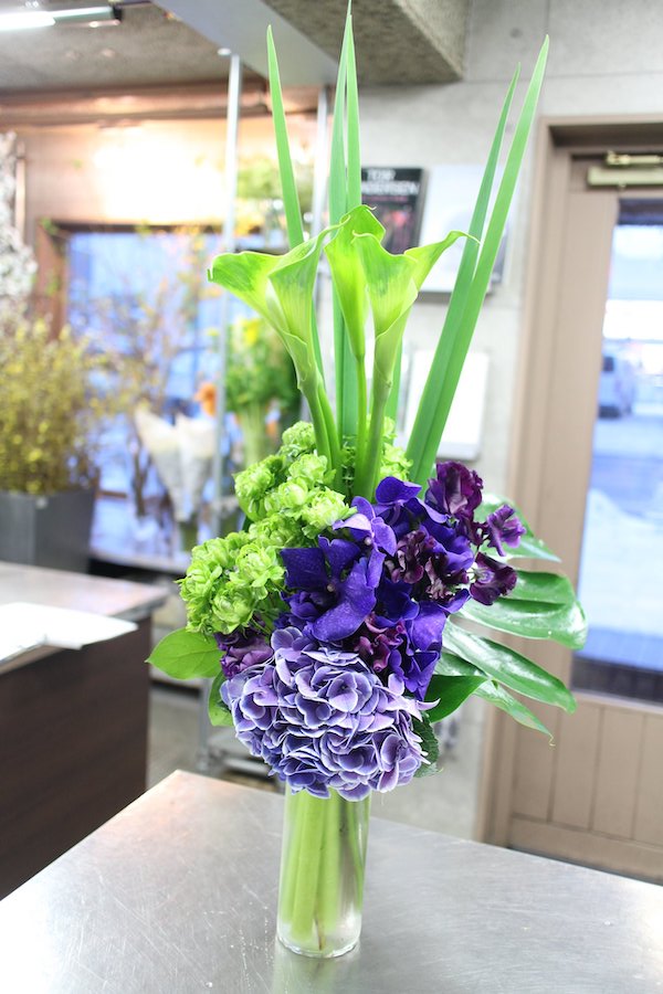 グリーンのカラーを用いてスタイリッシュな花束をお贈りさせていただきました。