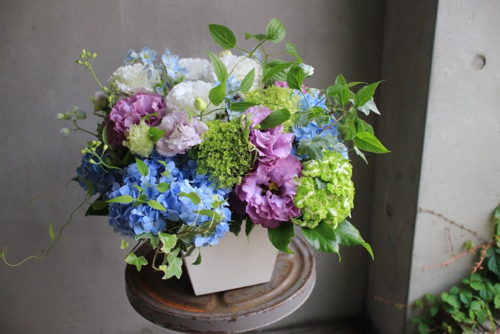 淡い色で命日のアレンジメントをお贈りいたしました。