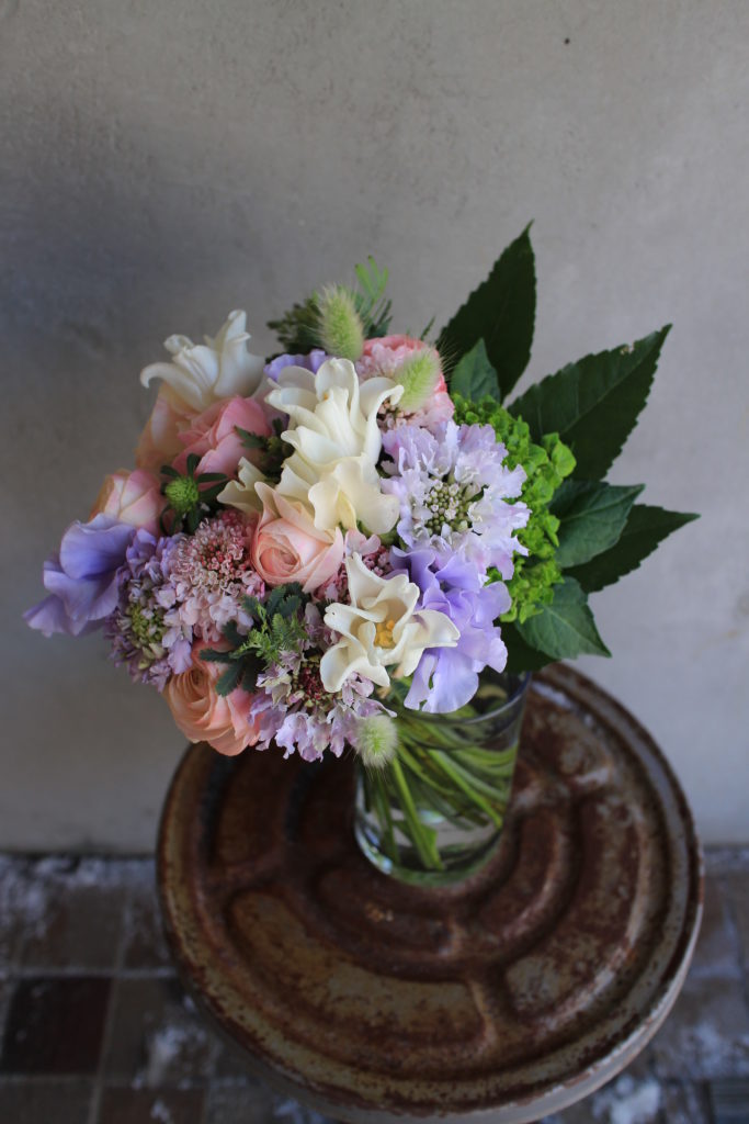 チューリップやスウィートピーといった 季節のお花を入れ 優しい色合いでお贈りさせて頂きました。